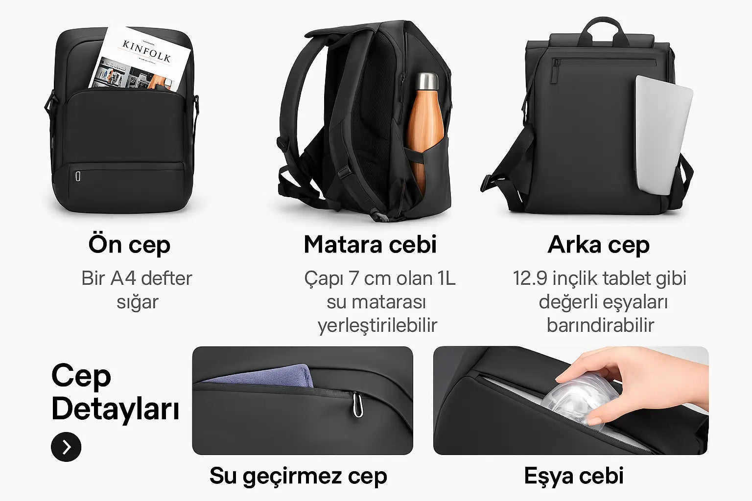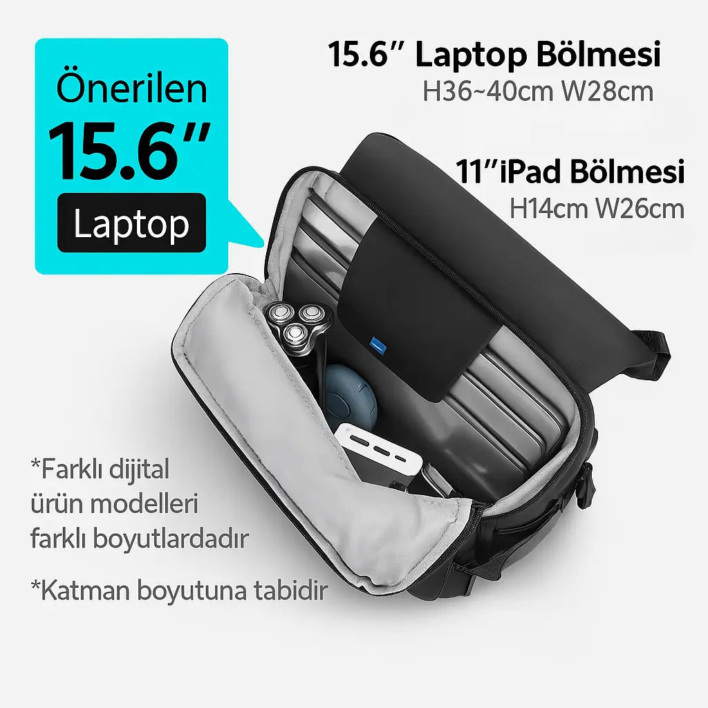 Laptop ve tablet için dolgulu özel bölmeler, iç düzenleyici paneller ve çoklu cepler (ön, arka, yan) içerir. Ayarlanabilir kayışlı, çıkarılabilir bel çantası ile telefon, cüzdan, kartlık gibi temel eşyalar için idealdir.