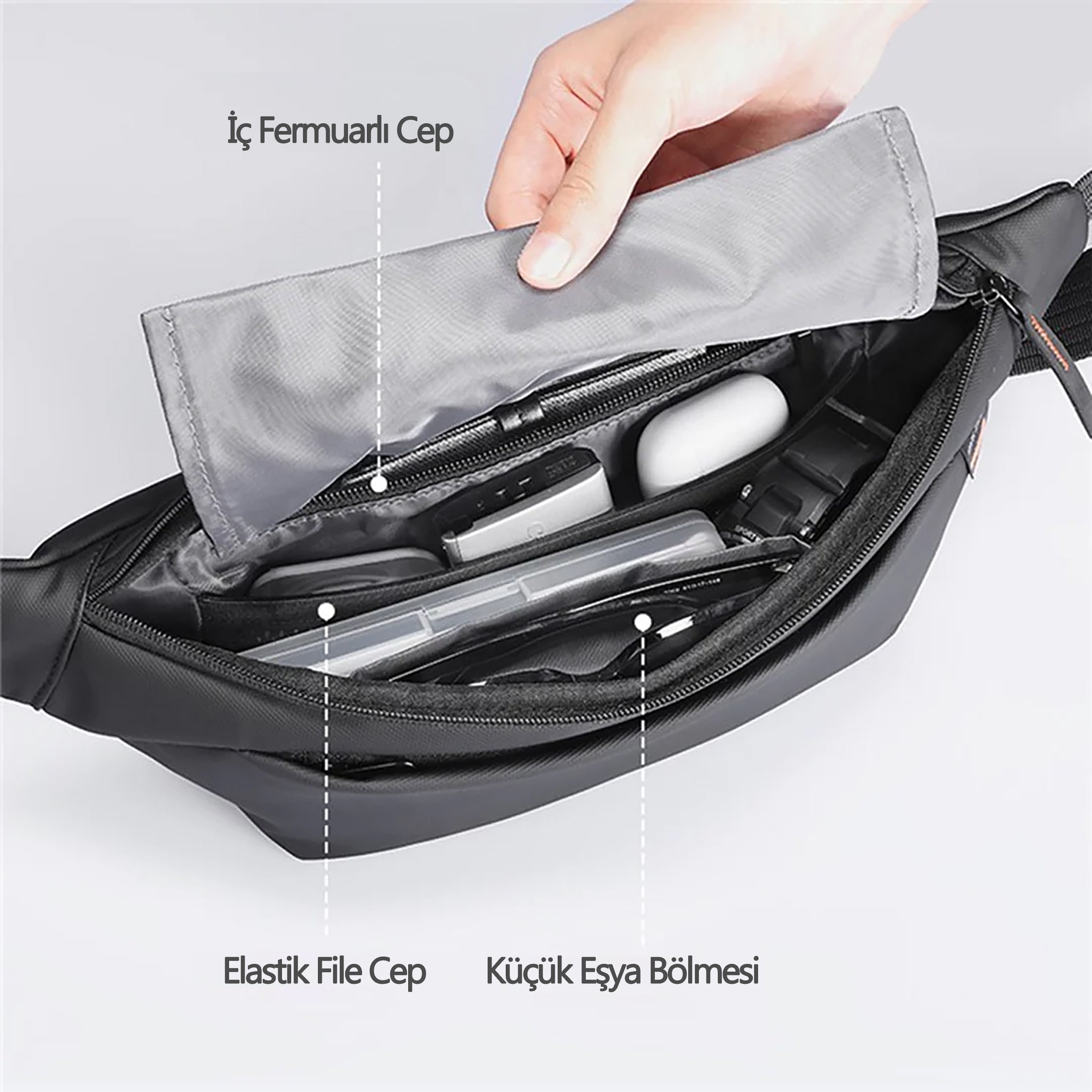 Brak çantasının iç bölmesi, günlük ihtiyaçlarınızı düzenli bir şekilde taşımanız için tasarlandı. İç fermuarlı cep, değerli eşyalarınızı güvenle saklarken; elastik file cep kablolar ve küçük aksesuarlar için mükemmel bir alan sunar. Ayrıca küçük eşya bölmesi sayesinde kulaklık, kartlık veya powerbank gibi eşyalar her an elinizin altında olur.