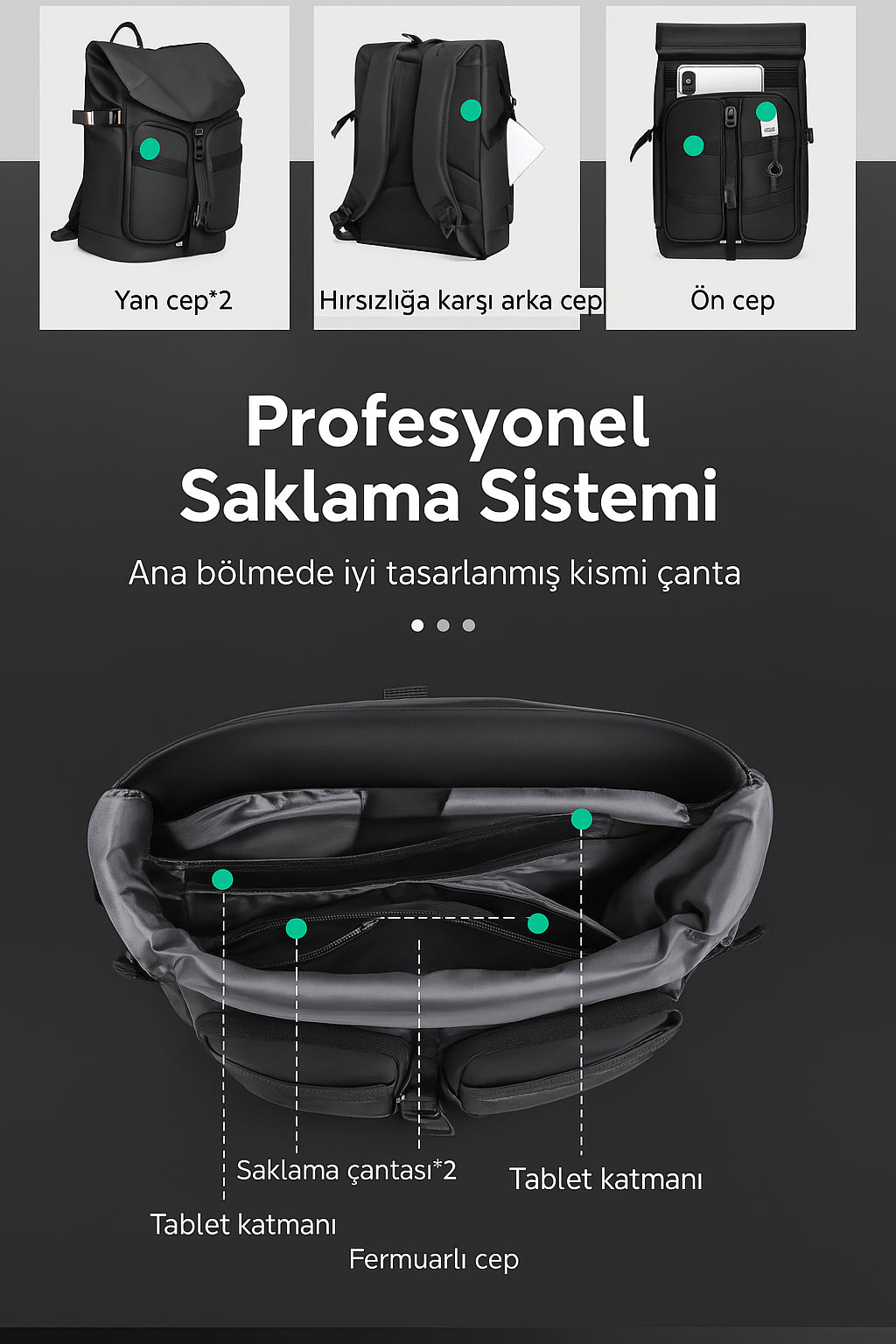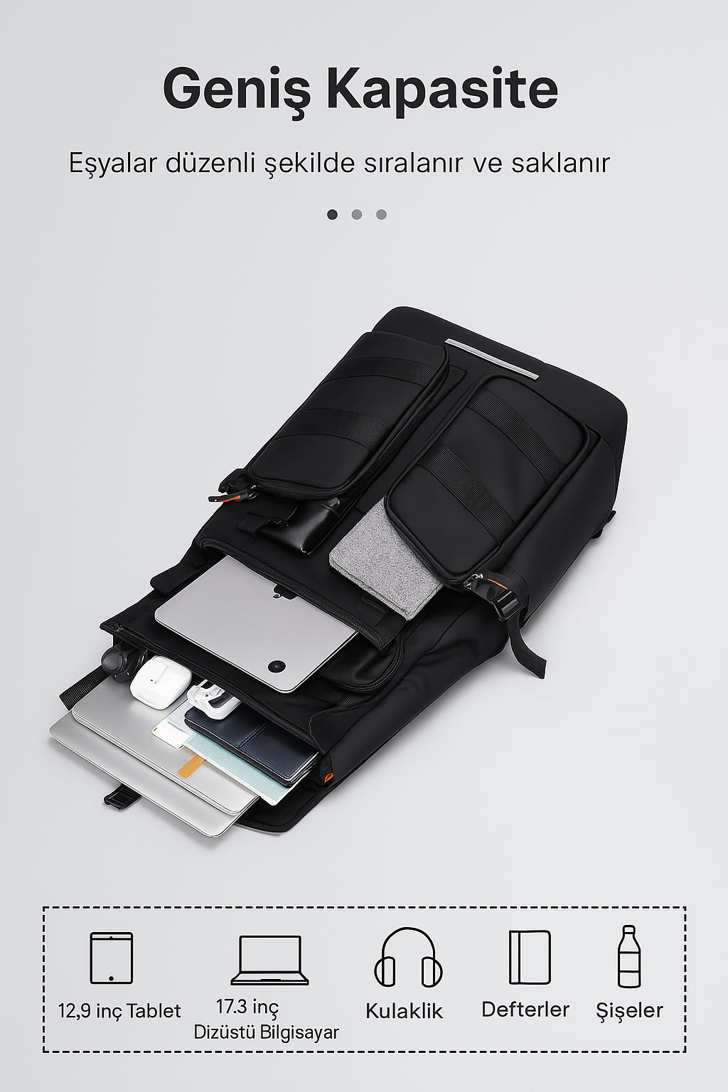 Geniş iç hacmi ve çok katmanlı bölmeleri sayesinde elektronik cihazlardan günlük ihtiyaçlara kadar her şey yerli yerinde. Laptop, tablet, kulaklık, cüzdan ve diğer tüm eşyalarınız için özel bölmeleriyle aradığınız her şeyi anında bulabilirsiniz. Hem ofis hayatında hem seyahatlerde maksimum verimlilik ve düzen sağlar.