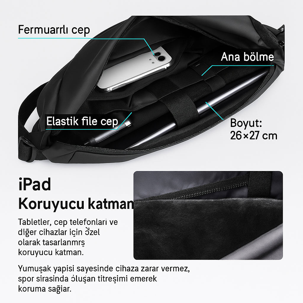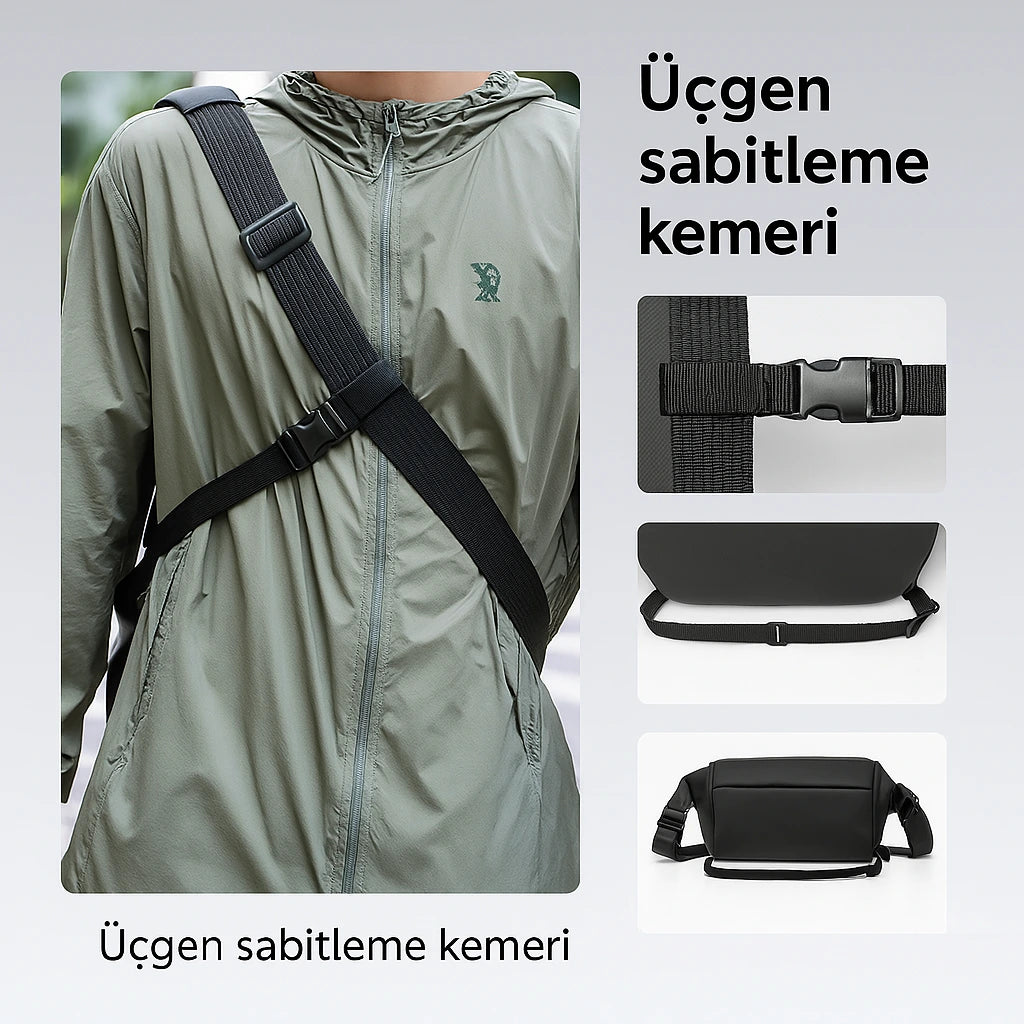 Citywalk çanta, yenilikçi üçgen sabitleme kemeriyle hareket halindeyken bile tam denge sağlar. Özellikle koşu, bisiklet ya da hızlı yürüyüş gibi aktivitelerde çantanızın vücutta sabit kalmasına yardımcı olur. Ayarlanabilir tasarımı sayesinde her bedene uyum sağlar, gün boyu konfor ve özgürlük sunar.