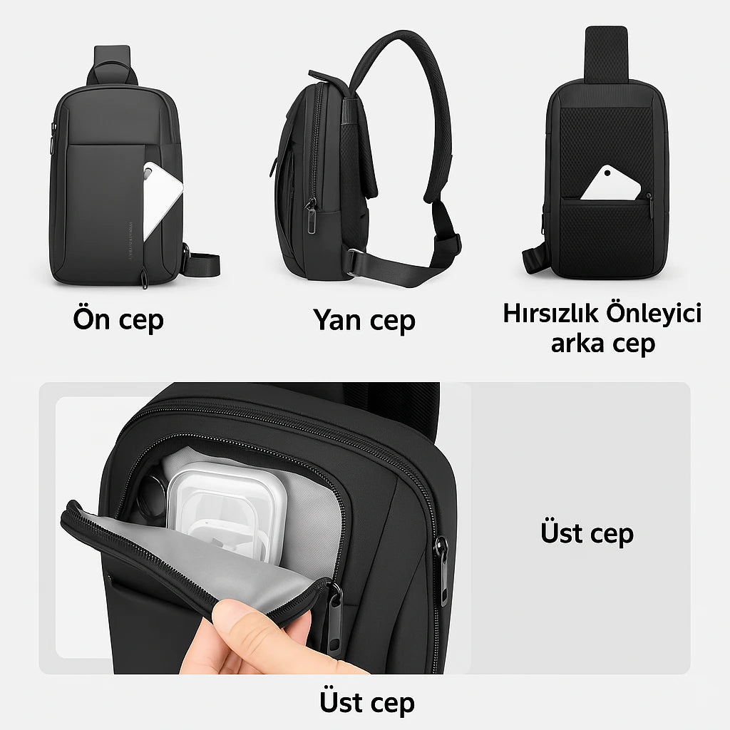 Ön yardımcı cep, üst küçük eşya bölmesi, yan cep, ana göz ve arkadaki Anti-Hırsızlık bölmesi ile telefon, pasaport, cüzdan, anahtar, powerbank ve kameranızı güvenle organize etmenizi sağlar.