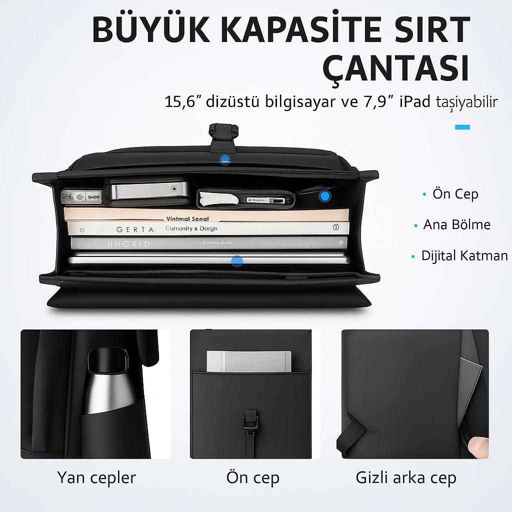 Ana bölmesi 15.6” laptop için uygundur. Ön cepler 7.9” iPad ve küçük aksesuarlar için tasarlanmıştır. Yan cep su şişesi için idealdir ve arka anti-hırsızlık cebi güvenli depolama sağlar.