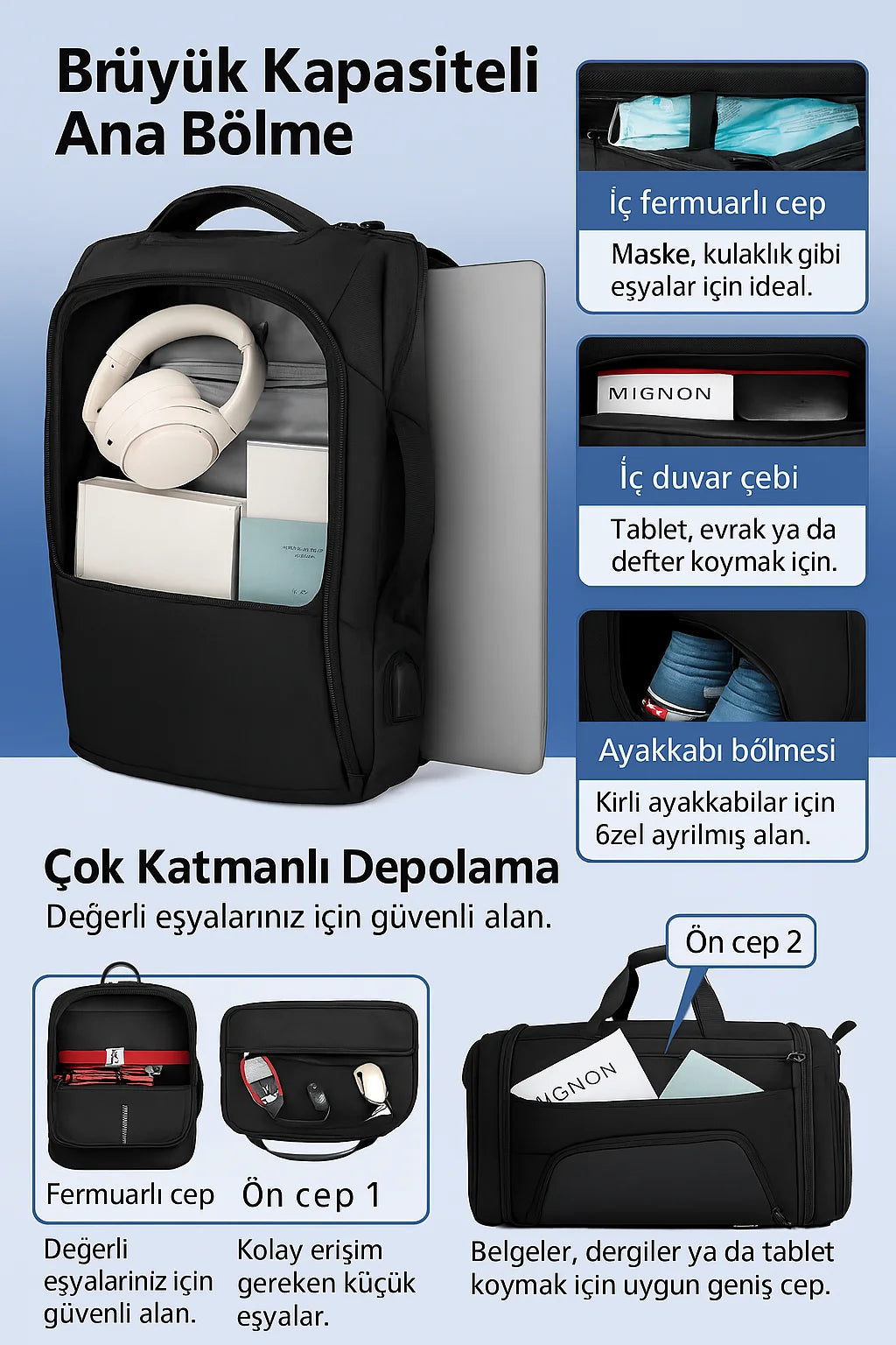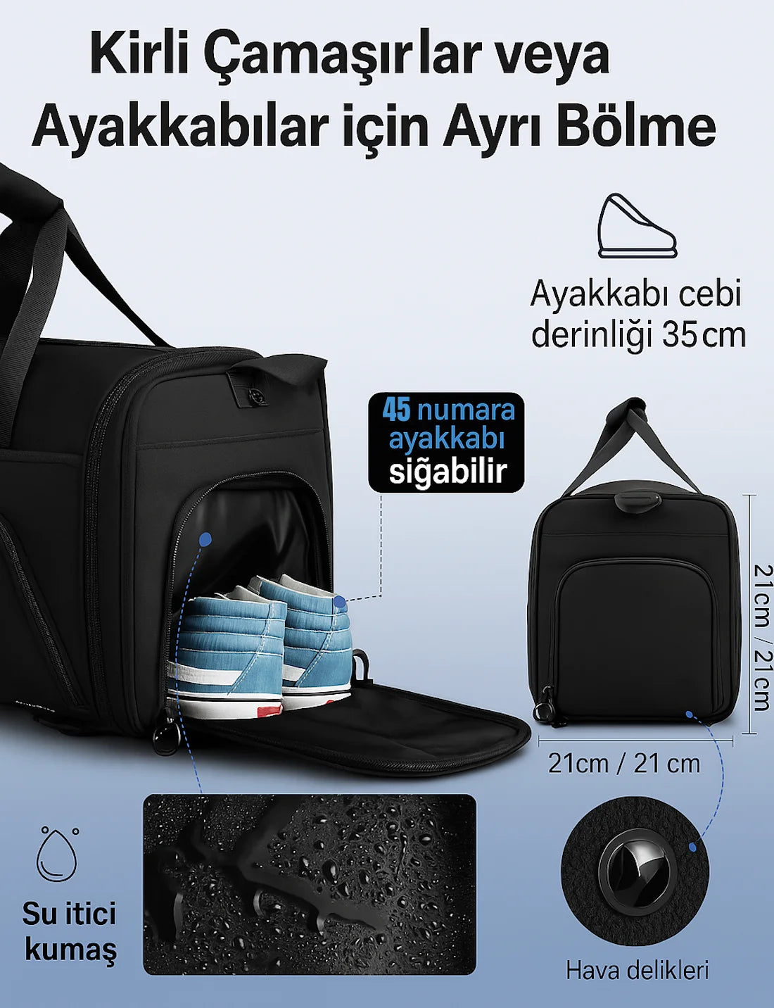 Alt kısımdaki özel fermuarlı bölüm ayakkabı veya kirli eşyalar için ayrılmıştır. Ana bölmeden bağımsız olduğu için çanta içindeki diğer eşyalarla temas etmez.