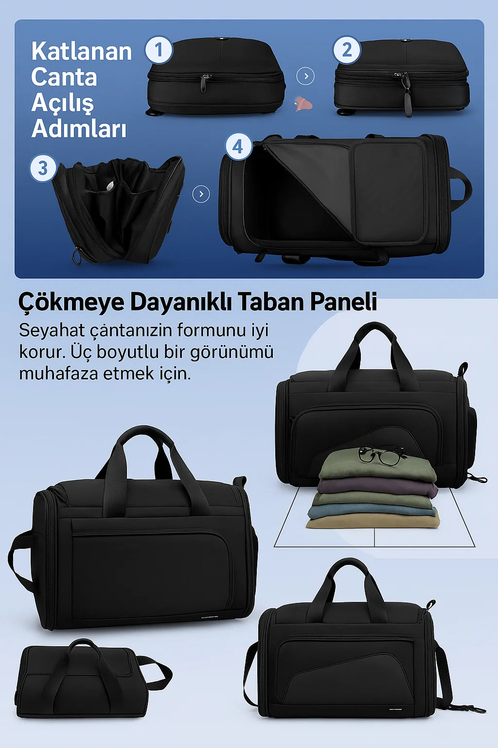 Bu çanta, katlanabilir yapısıyla günlük kullanımda kompakt bir sırt çantası formunda kullanılır. İhtiyaç duyduğunuzda alt kısımdaki fermuarlı bölmeyi açarak kolayca genişletebilir ve seyahat çantası haline getirebilirsiniz. Bu sayede hem günlük işlerinizde hafif kullanım sunar hem de seyahatlerde ekstra depolama alanı sağlar.