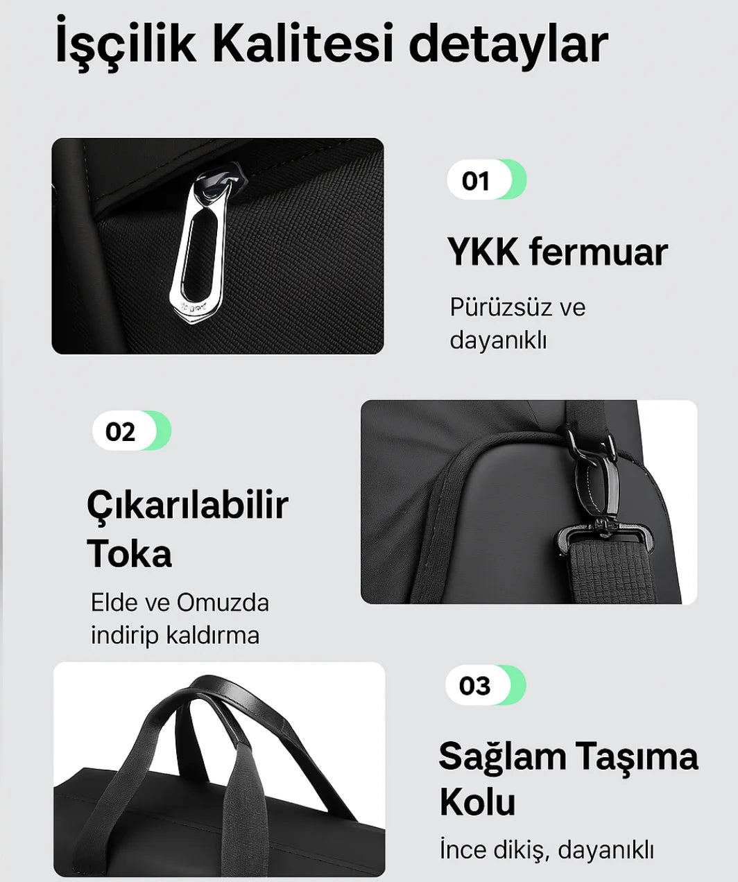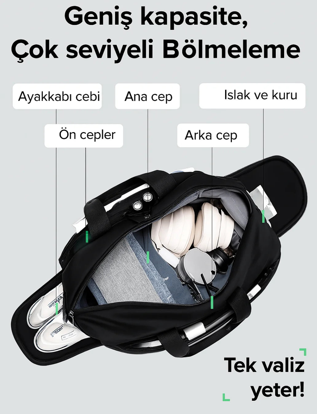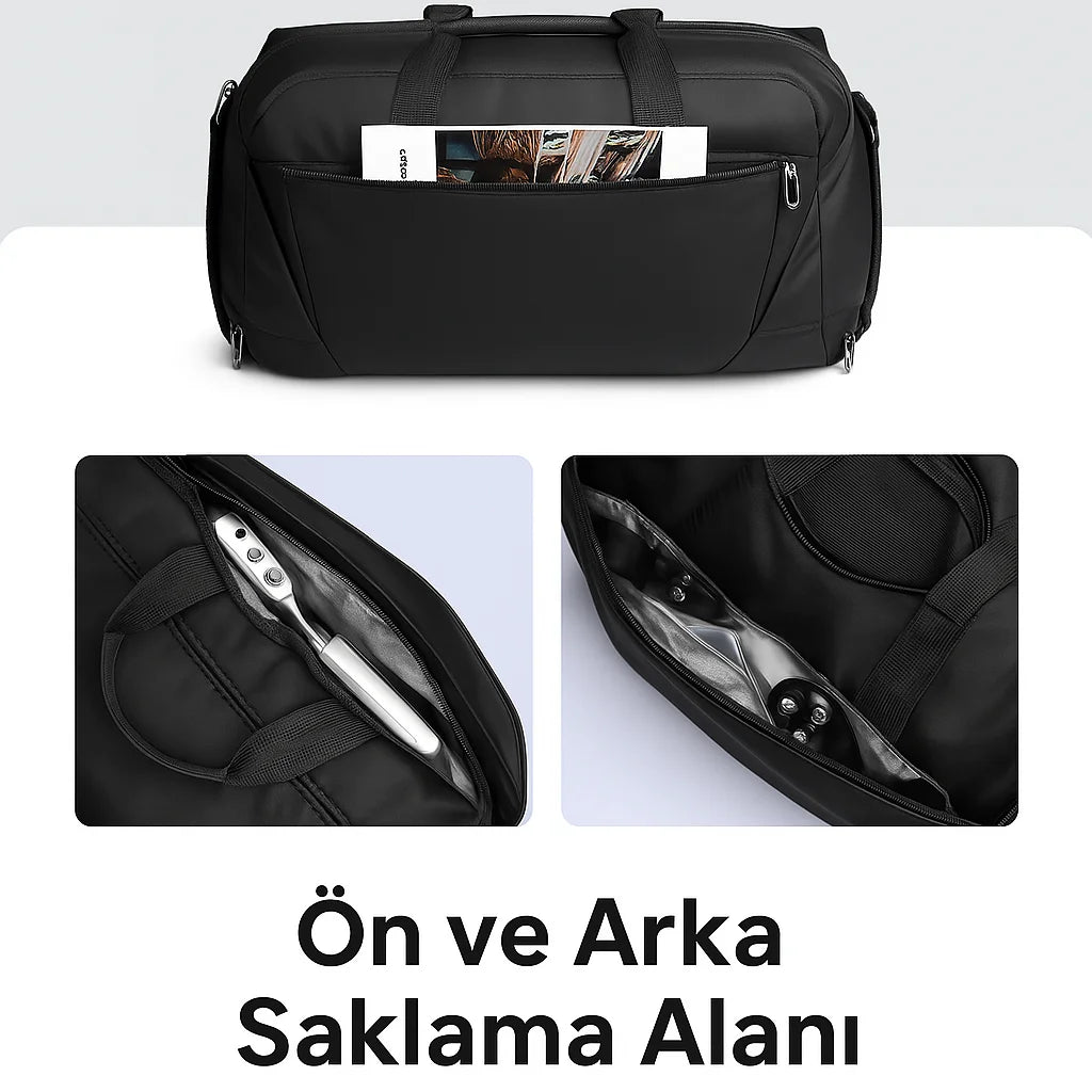 Çok katmanlı alan tasarımı ile ayakkabı, kıyafet, elektronik eşyalar ve kişisel aksesuarlar için ayrı bölmeler sunar. Hem kuru hem ıslak eşyalarınız için ideal taşıma çözümü.