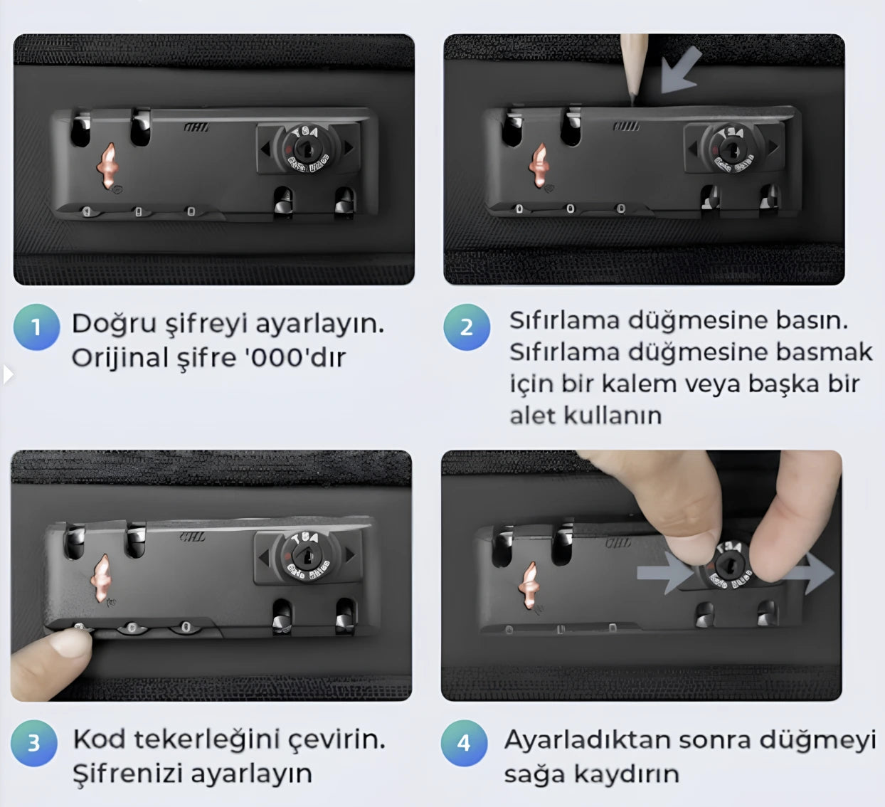 • Adım 1: Kilidi açmak için varsayılan kombinasyonu (genellikle 0-0-0) ayarlayın.