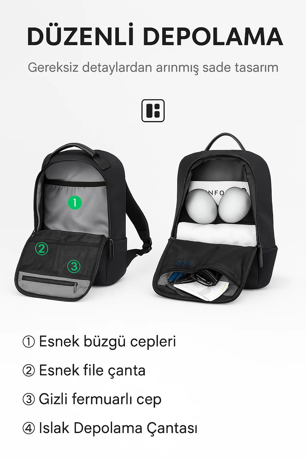 Su geçirmez alt cep ve kalınlaştırılmış alt iç panel, çantanızı ve eşyalarınızı korur. Sağlam malzemeler uzun ömürlü kullanım sunar.