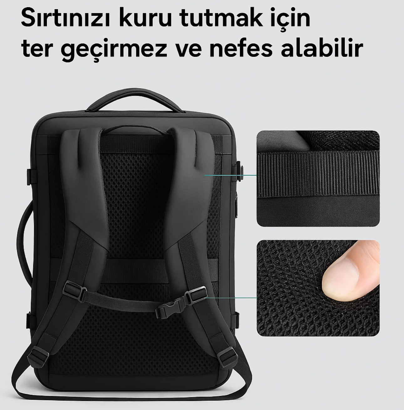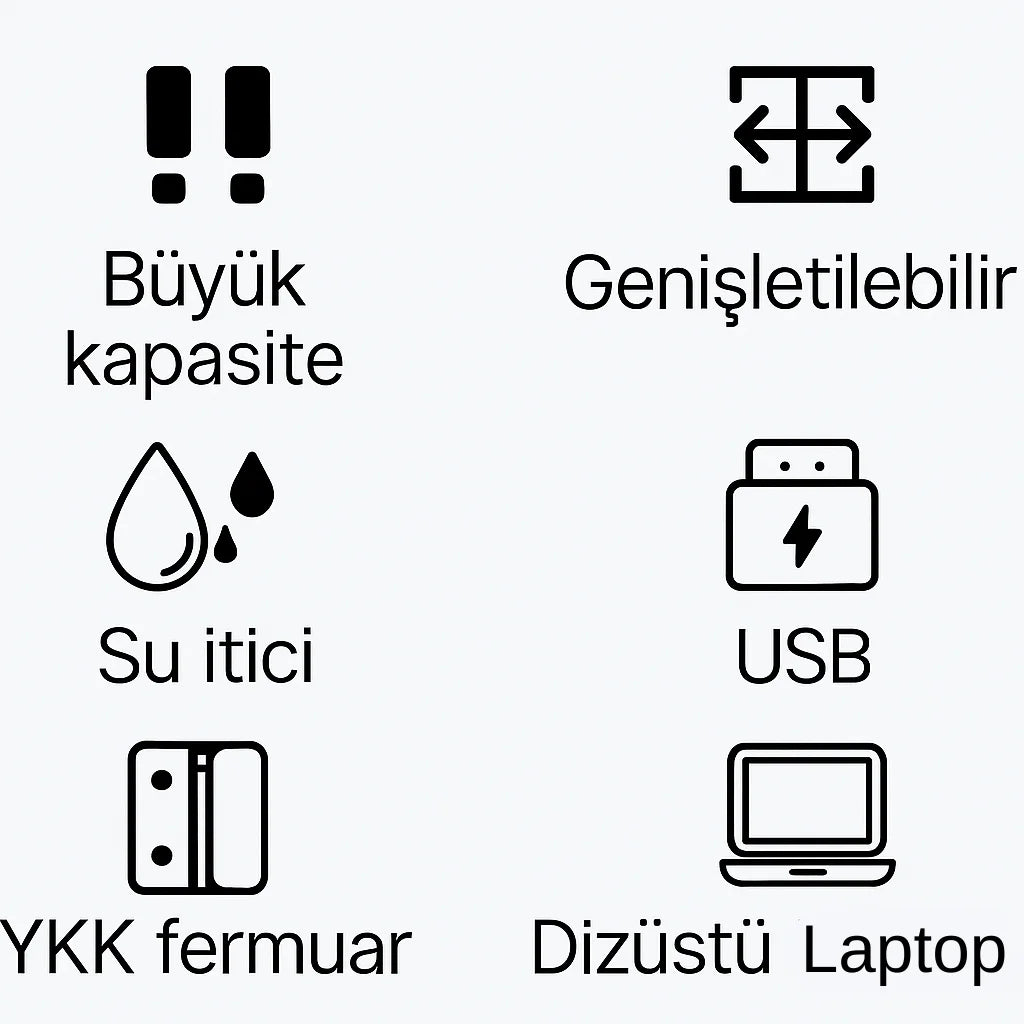 Büyük kapasitesiyle geniş depolama alanı sunar. İhtiyaç duyduğunuzda ekstra alan sağlayan genişletilebilir tasarımı, suya dayanıklı yapısı ve dayanıklı YKK fermuarları ile kullanım kolaylığı sağlar. Ayrıca dahili USB bağlantı noktasıyla cihazlarınızı hareket halindeyken rahatça şarj edebilir ve özel dizüstü bilgisayar bölmesiyle teknoloji ürünlerinizi güvenle taşıyabilirsiniz.