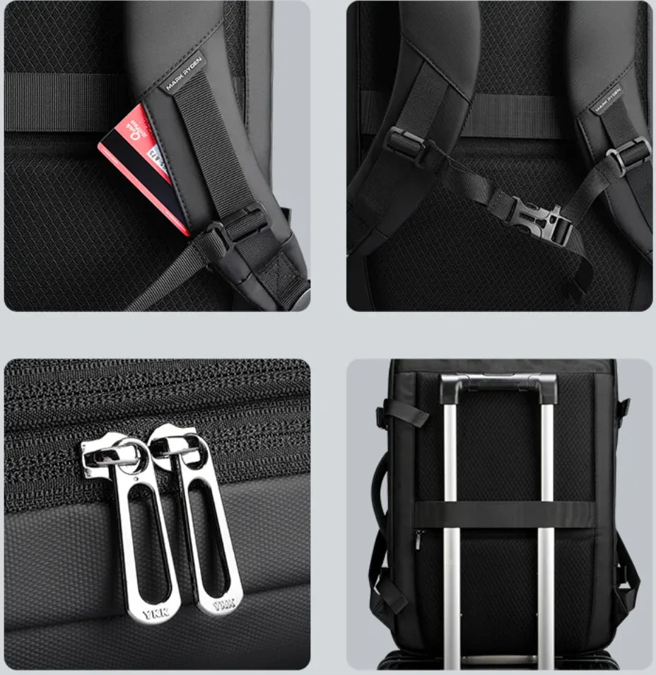2 ön cep + 1 ana bölme (4 açık cep + 3 kalem yuvası + 1 fermuarlı cep) + 1 genişleme bölmesi (1 kuru-ıslak ayırıcı + 1 büyük fermuarlı file cep) + 1 dijital katman (1 laptop bölmesi + 1 tablet bölmesi) + 1 yan cep + 1 anti-hırsızlık arka cep