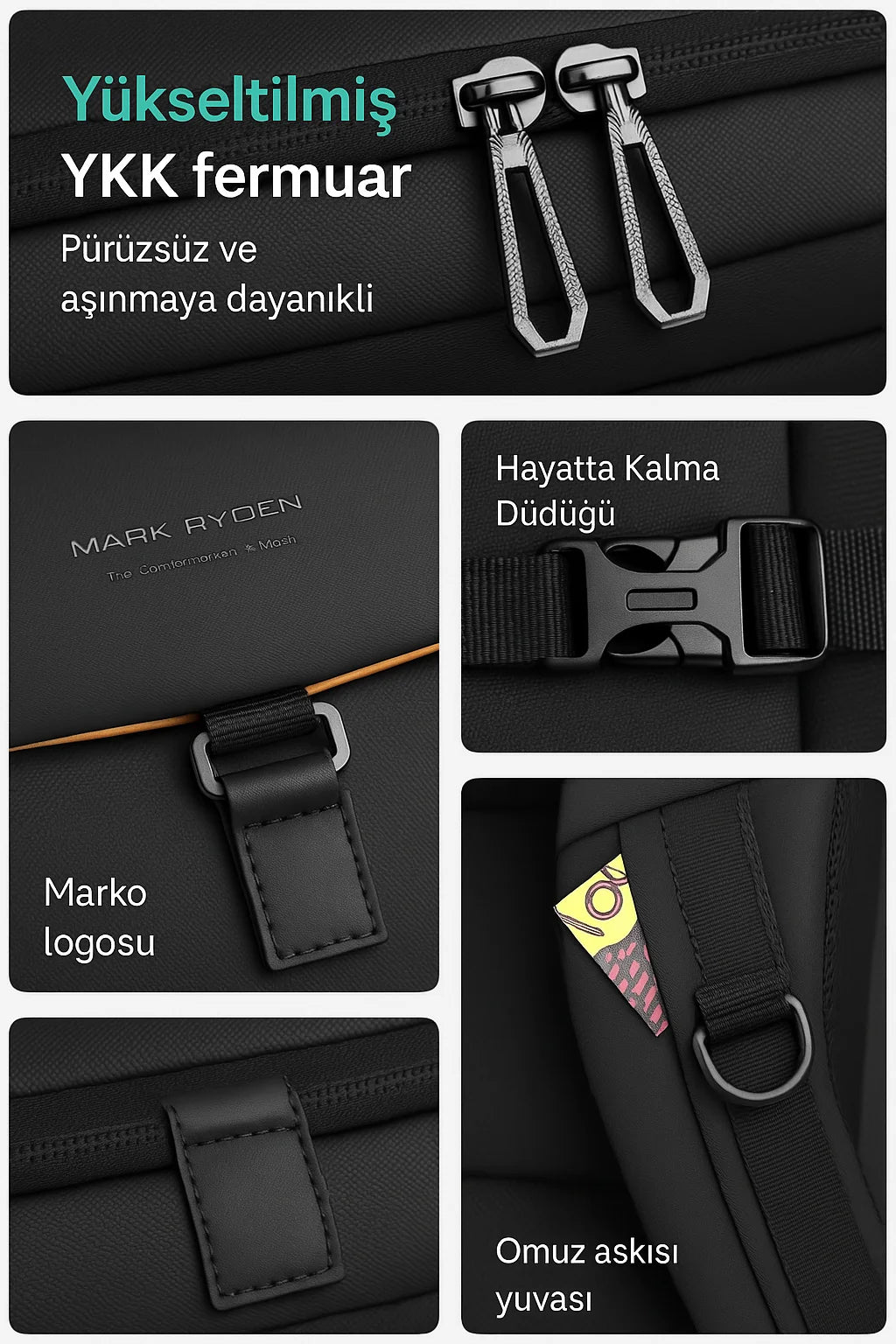 Mark Ryden FileMaster çantasının üstün malzeme kalitesi ve detaylara verilen önem, kullanım deneyimini zirveye taşıyor. Yükseltilmiş YKK fermuarlar pürüzsüz çalışır ve aşınmaya karşı dayanıklıdır. Çantanın ön yüzündeki Marka logosu şıklık katarken, hayatta kalma düdüğü acil durumlarda ekstra güvenlik sunar. Omuz askısı üzerindeki gizli yuva pratik saklama alanı sağlarken, sağlam toka sistemi ve estetik dikiş detaylarıyla bu çanta hem fonksiyonel hem de stil sahibi bir tercihtir.
