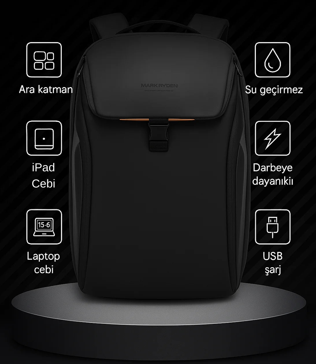 Mark Ryden FileMaster sırt çantası, işlevselliği ve şıklığı bir araya getiriyor. Ara katmanlar sayesinde eşyalarınızı kolayca organize edebilir, iPad ve 16 inç’e kadar laptop için özel bölmeleri kullanabilirsiniz. Su geçirmez yapısı ile yağmurlu günlerde bile eşyalarınız güvende kalır. USB şarj portu sayesinde hareket halindeyken bile cihazlarınızı şarj edebilir, darbelere karşı dayanıklı yapısıyla uzun ömürlü kullanımın keyfini çıkarabilirsiniz.