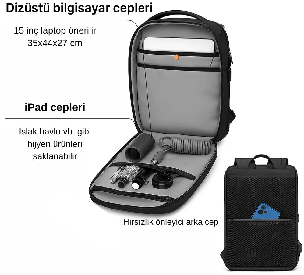 TSA onaylı kilit, arka anti-hırsızlık cebi ve trolley askısı ile güvenli taşımayı garanti eder. Hem şehir içinde hem seyahatlerde eşyalarınızı korur.