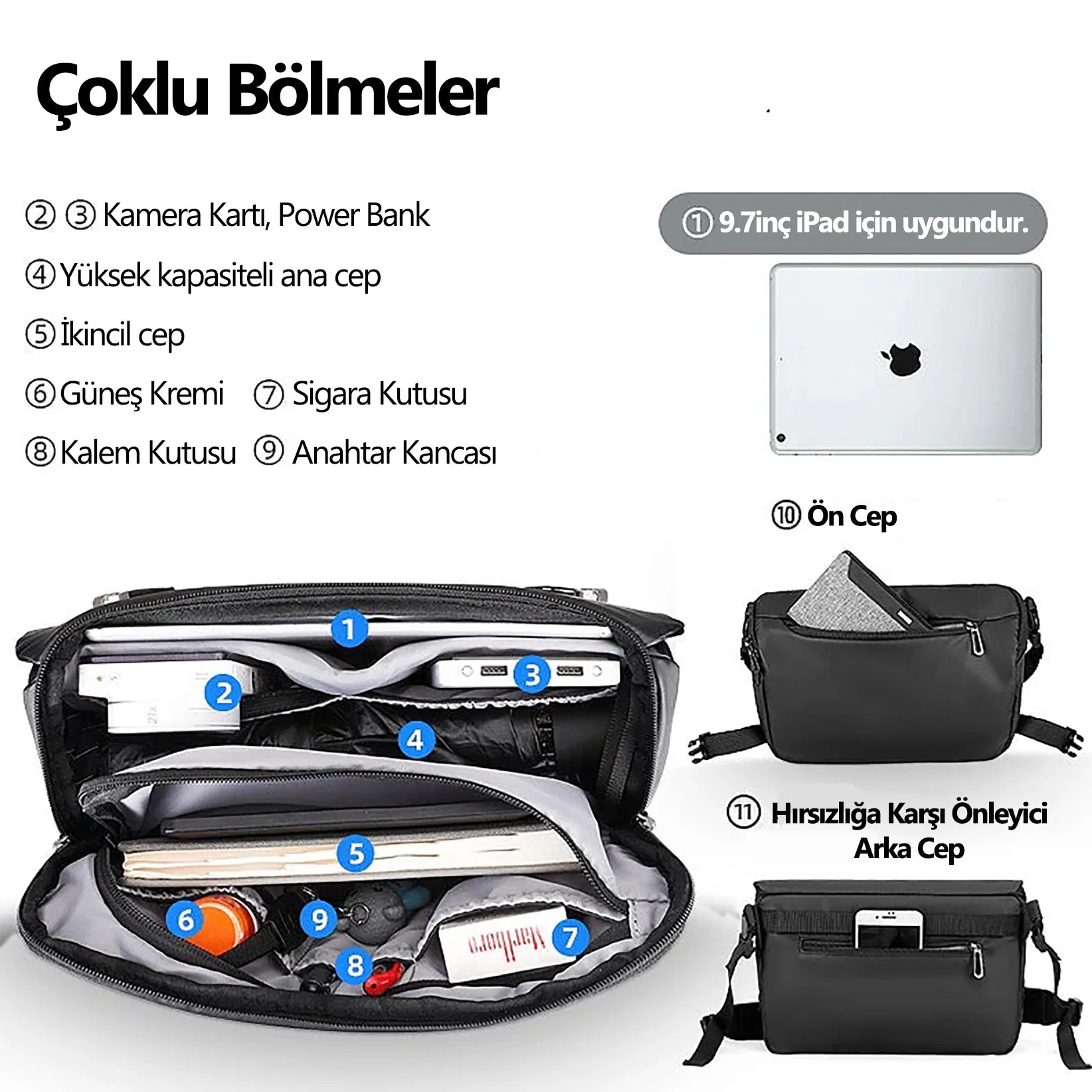 9.7 inç iPad’inden power bank’ine, kalemliğinden anahtarına kadar her şeyin yeri hazır. Önde kolay ulaşabileceğin bir cep, arkadaysa hırsızlığa karşı gizli bir bölme var. Günlük koşturmada “şunu nereye koymuştum?” sorusunu unutturacak kadar pratik. Eşyalarını yerleştir, kapağını kapat ve güne konforlu bir adım at!
