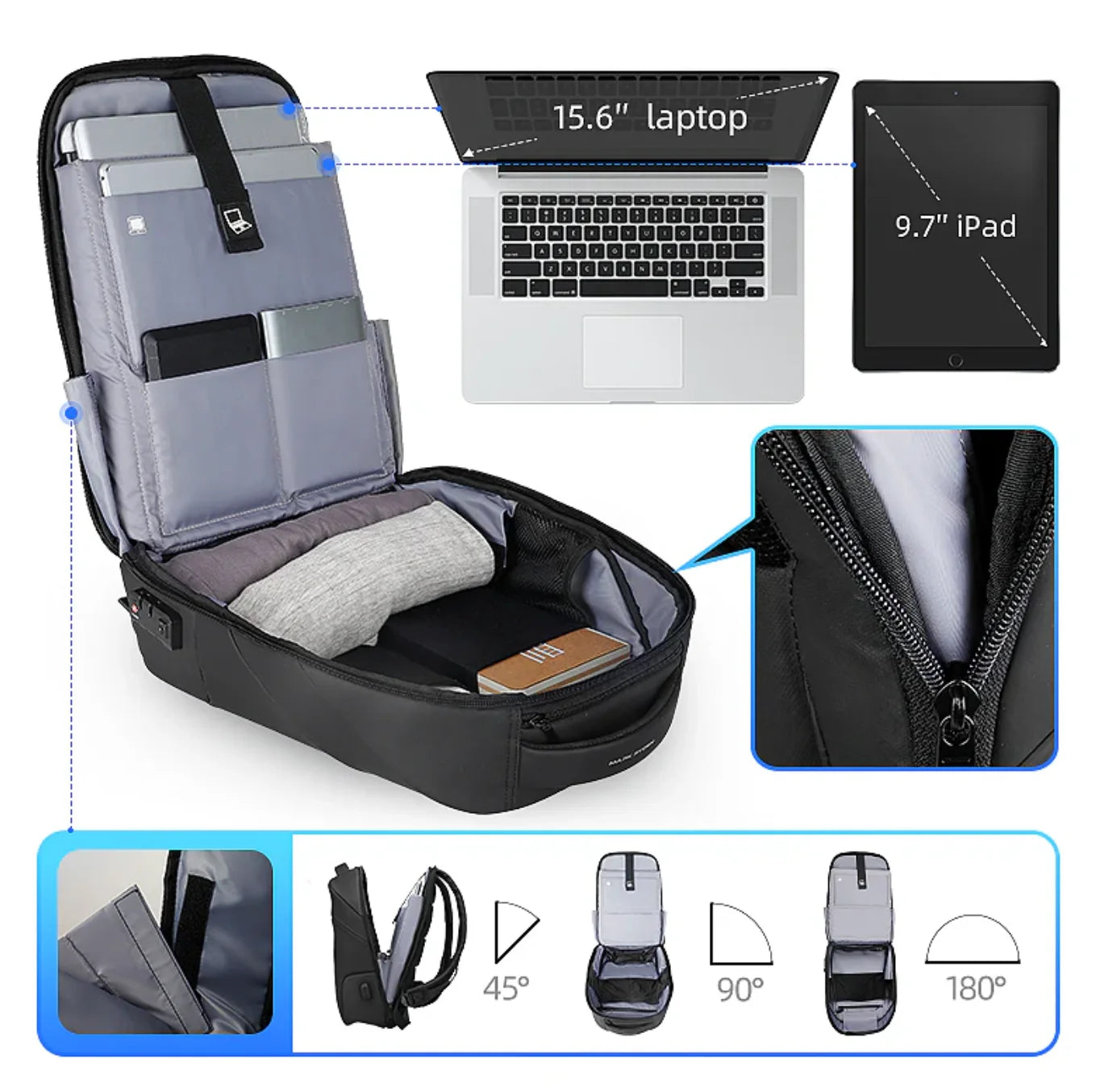 15.6” laptop için ana bölme ve 7.9” iPad için gizli arka cep ile eşyalarınızı güvenle taşıyabilirsiniz.