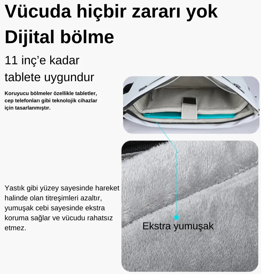 Tabletin ya da telefonun çantada zarar görecek diye endişelenme! Bu çantanın 11 inç’e kadar cihazlar için özel olarak tasarlanmış dijital bölmesi, ekstra yumuşak iç yüzeyiyle hem cihazlarını korur hem de sana konforlu bir kullanım sunar. Yastık gibi dokusu sayesinde titreşimleri azaltır, taşırken vücudu rahatsız etmez. Hem teknolojine hem sana iyi gelir!