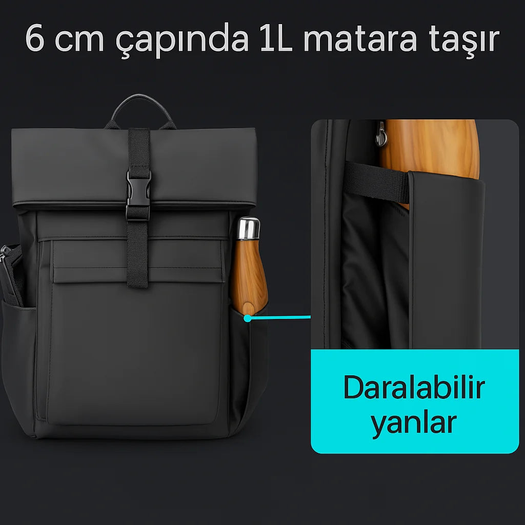 Minimalism II modeline ek olarak gelen matara cebi sayesinde gün boyu yanında suyun eksik olmasın! Bu çanta, 6 cm çapındaki 1 litrelik mataraları rahatça taşıyabilecek şekilde tasarlandı. Daralabilir yan cepleri sayesinde matarayı sıkıca kavrar, boşken ise çantanın formunu korur. Hem pratik hem şık bir detay!