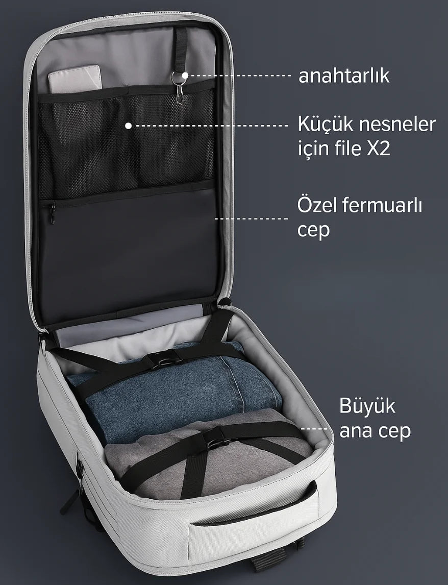Bu sırt çantasında dağınıklığa yer yok! Anahtarlık bölmesinden küçük eşyalar için file ceplere, özel fermuarlı bölmeden geniş ana göze kadar her şey düşünülmüş. Kıyafetlerin düzenli, teknolojik eşyaların güvende, günlük koşturmacan ise çok daha kolay. Hem seyahatte hem günlük kullanımda konforu ve düzeni bir arada sunar.