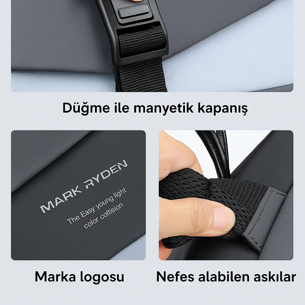 Mark Ryden çantanın her detayı, günlük kullanım kolaylığını en üst seviyeye çıkarmak için tasarlandı. Düğme ile kolayca açılıp kapanan manyetik tokası sayesinde çantanız hep güvende. Nefes alabilen askılar omzunuza yük bindirmezken, sade ve şık marka logosu ise stilinizi tamamlar. Şıklık ve fonksiyon tek çantada buluştu!