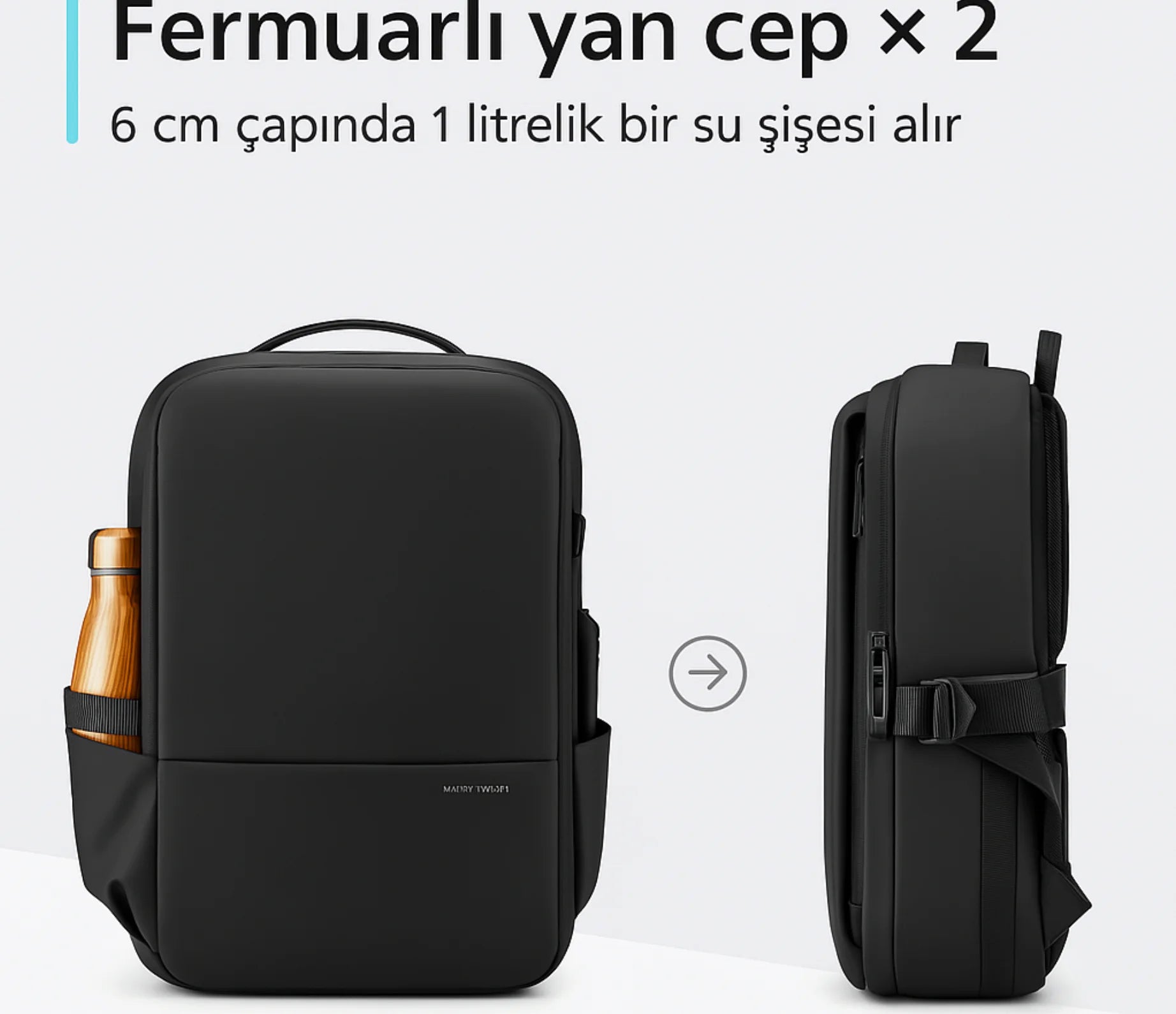 Her iki yanda bulunan fermuarlı cepler sayesinde su şişeniz veya şemsiye gibi eşyalarınız için ekstra yer açılıyor. 6 cm çapında 1 litrelik bir şişeyi kolayca alabilen bu cepler, hem pratiklik hem de düzen arayan kullanıcılar için ideal. Gün boyu ihtiyaç duyduğunuz her şey artık elinizin altında!
