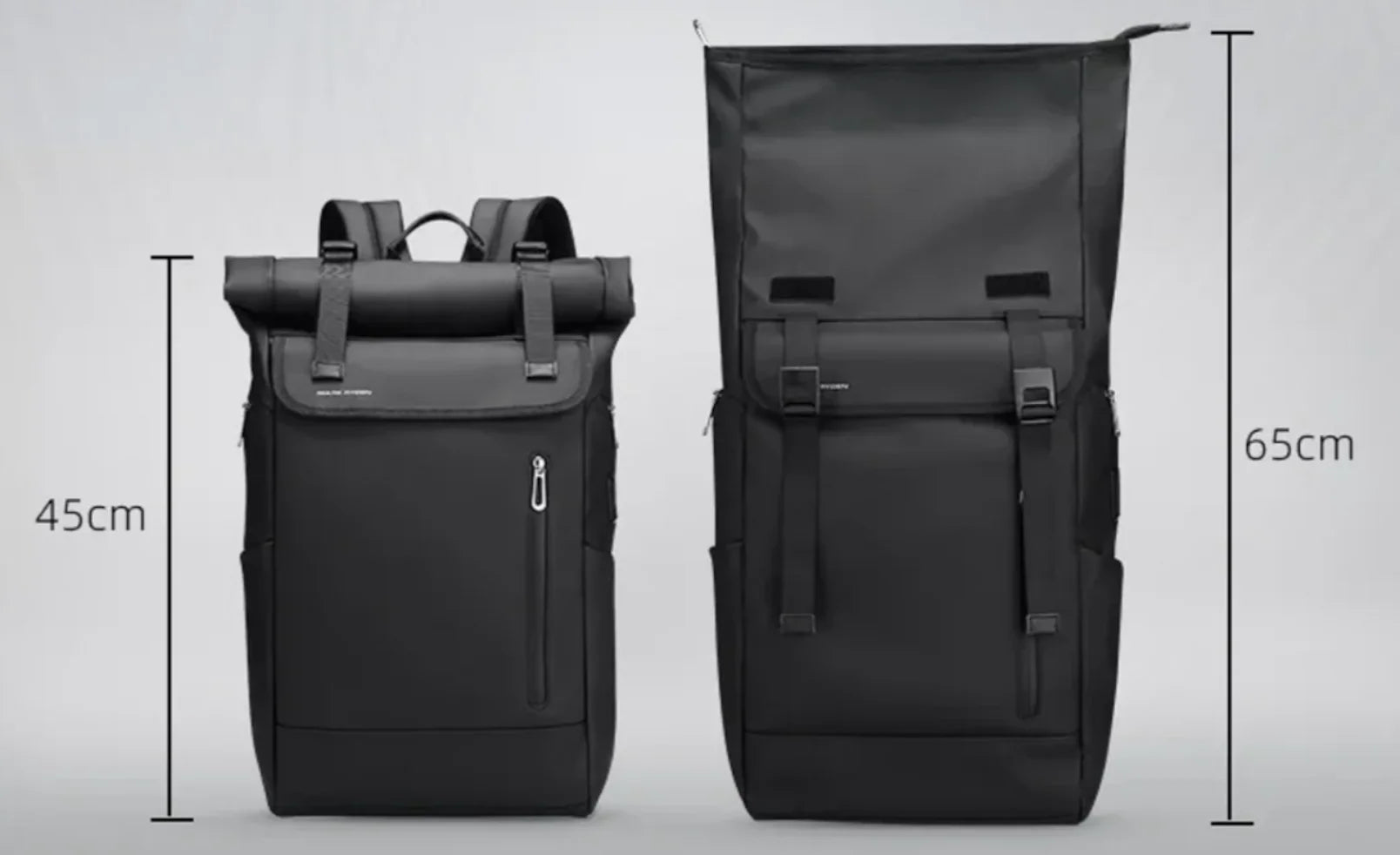 Yuvarlak üst kapak kısmı yukarı doğru açılarak çantanın yüksekliği 45 cm’den 65 cm’ye çıkarılabilir, böylece iç hacim 29 litreye ulaşır.
