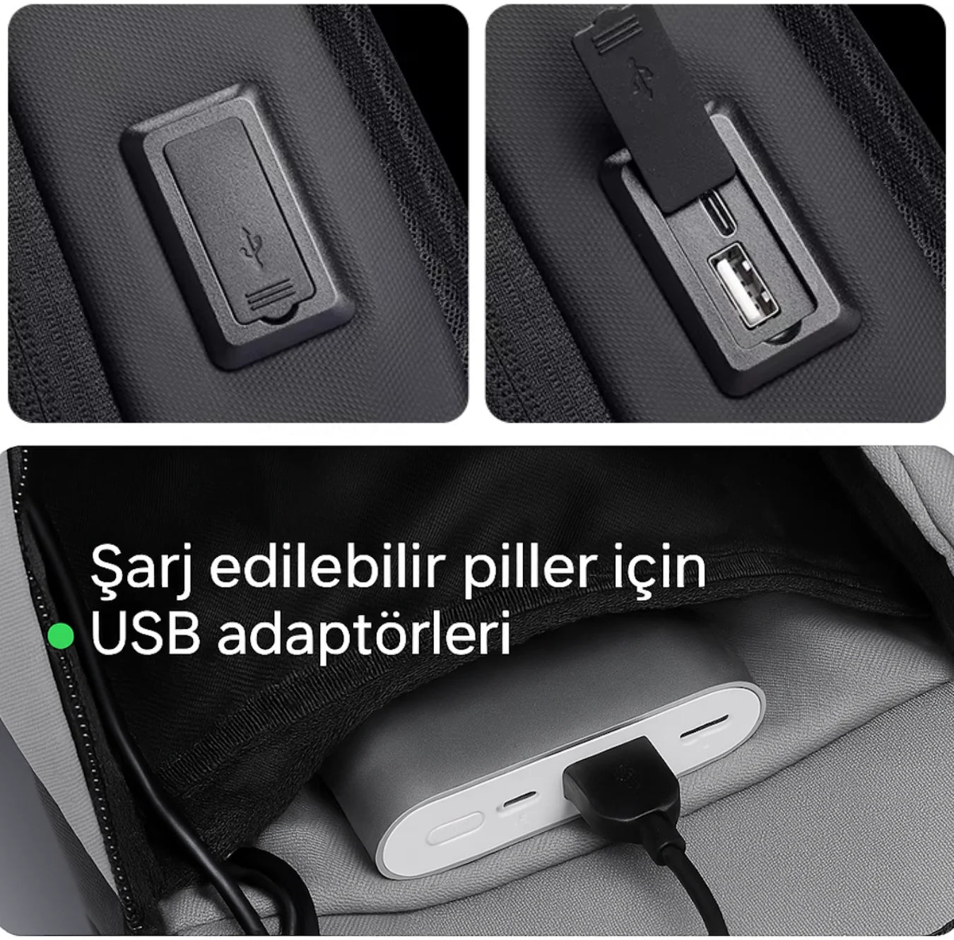 • Adım 1: Çantanızın iç kısmındaki USB kablosunu bulun ve bir güç kaynağına (power bank) bağlayın. Bu bağlantı, şarj cihazınızdır.